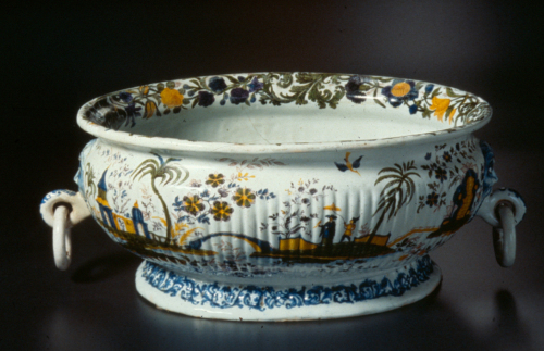 grande vasca ovale con parete bombata fittamente costolata, anse a forma di mascheroni reggenti anelli; decoro policromo