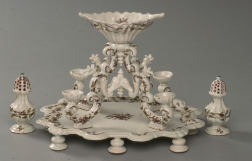 eleborato centrotavola a sopralzo dotato di piedini di sostegno, con saliera e pepiera; decoro policromo