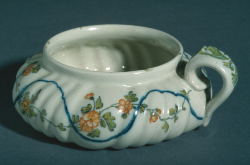 ptialoforo a base rotonda con costolature longitudinali e ansa a nastro; decoro policromo