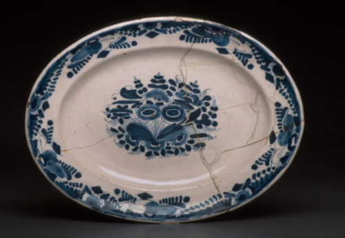 piatto ovale con breve tesa e orlo rialzato; decoro in monocromia blu