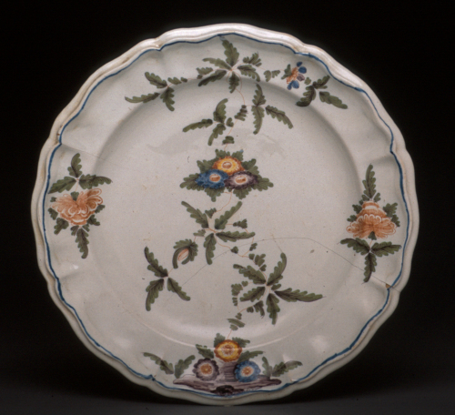 grande piatto rotondo con tesa a coste orlo mistilineo; decoro policromo