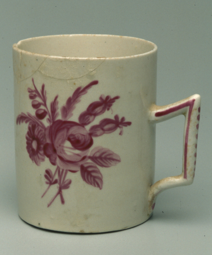 tazza cilindrica da the con manico mistilineo; decoro in monocromia viola