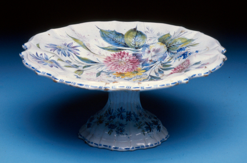 alzata rotonda su piedistallo, tesa a coste con orlo mistilineo; decoro policromo