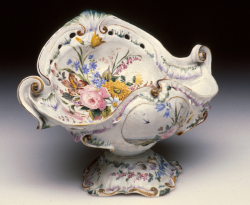 soprammobile conformato ad ampia vasca mistilinea su piedistallo; decoro policromo