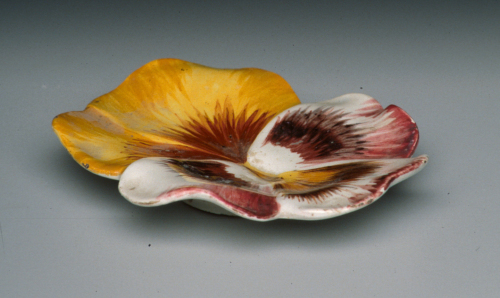 piattino conformato a pansè con cinque petali; decoro policromo