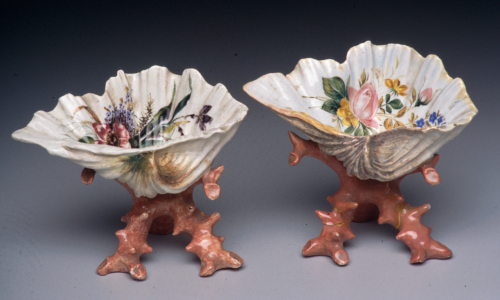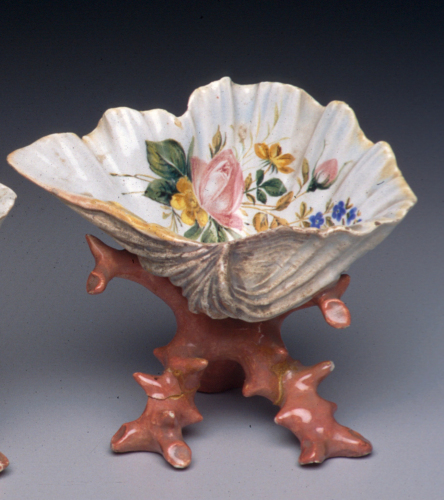 soprammobile a forma di conchiglia sorretta da treppiede coralliforme; decoro policromo