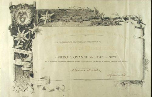 diploma di benemerenza a Giovanni Battista Viero per la sua produzione di ceramiche artistiche; decoro ad incisione
