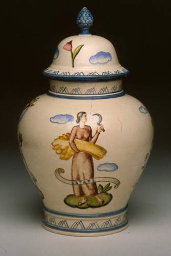 grande vaso con ventre espanso, dotato di coperchio con presa a pigna; decoro policromo