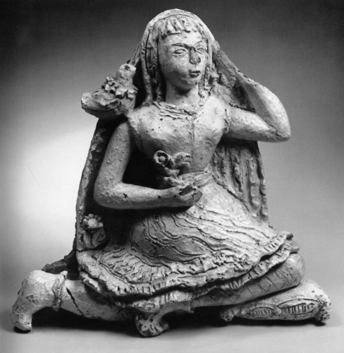 statuetta antropomorfa in altorilievo raffigurante una giovane donna inginocchiata