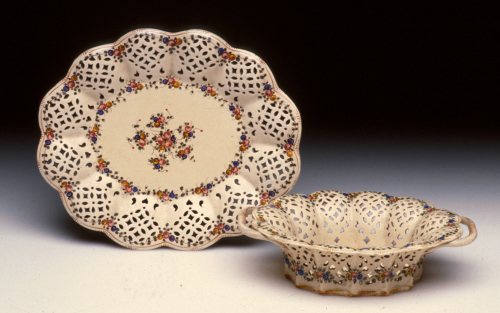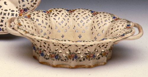 cestino ovale finemente traforato e dotato di manici; decoro policromo