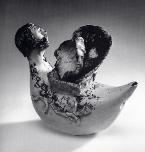 cucca conformata a corpo di colomba con testa umana e due ritratti sul dorso; decorazione policroma