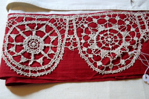 Bordura di merletto ad ago e rosoni. Supporto in tela cerata rossa