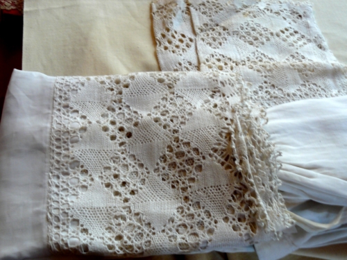 Bordura e polsi con merletto a fuselli (punto tela, treccia, mezzo punto, parigi)
