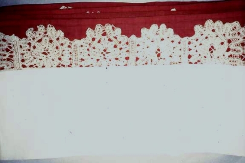 Bordura di merletto a fuselli. E' composto da due elementi di diversa tipologia e datazione (tra XVIII e XIX secc.). Il supporto è di tela rossa.