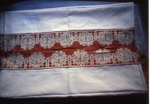 Bordura a fuselli, lino, tipologia "russa". Supporto diagonale rossa.