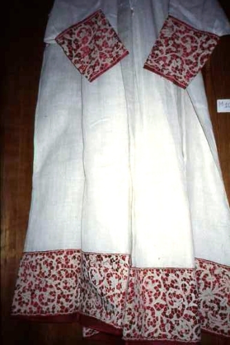 Batista di lino.Bordura di merletto a fuselli, punto Venezia e punto tela. Supporto di raso rosso sotto la bordura di lino. Fermaglio al collo in argento.