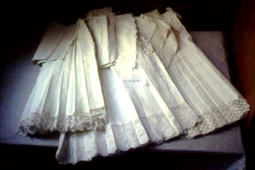 Tipologia "discreta". Bordura a fuselli con punto tela garzato e fondo a rete lombarda. Sullo scollo merletto meccanico.