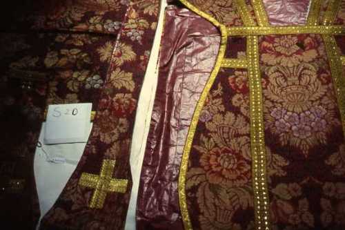 Tessuto operato su fondo di raso e fodera di tela cerata rossa. Il velo da calice non è foderato.