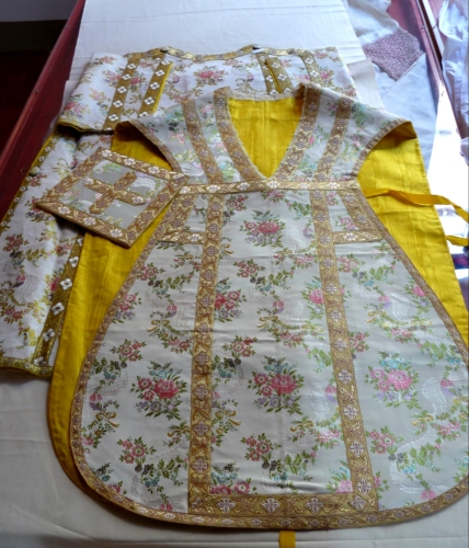 Gros lanciato con motivo settecentesco su fondo bianco a fiori policromi.
