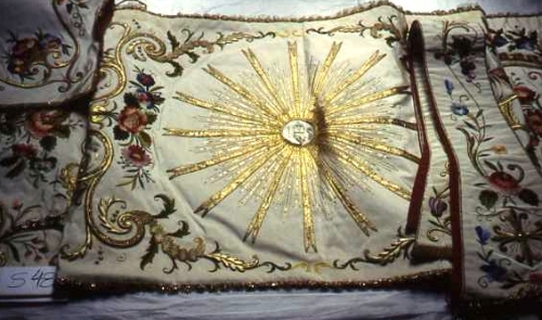 Gros de tours ricamato con sete policrome molto ritorte, con oro e argento filati e lamellari. Borchie, paillettes e varie tipologie di punti (oro posato, oro passato su imbottiture)