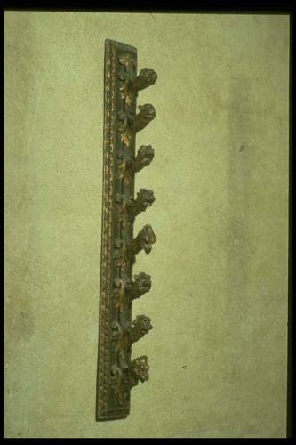 base rettangolare modanata; ganci lavorati ad altorilievo con motivi decorativi: teste di cani, teste di uccelli predatori