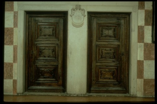 Le iniziali "P.M." sono le stesse che si ritrovano incise, con simile modalita', nella mostra di porta al primo piano dell'appartamento Marcello: fanno riferimento a Pietro Marcello. Tuttavia, Barbantini riferisce l'iniziativa di questo intervento, avvenuto dopo le distruzioni portate dalla guerra di Cambrai, al figlio Giacomo Antonio.