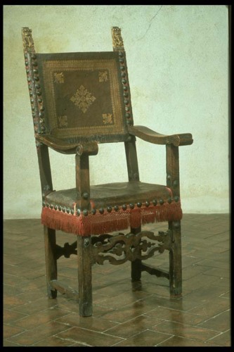 legno intagliato/ dorato / cuoio impresso / tessuto