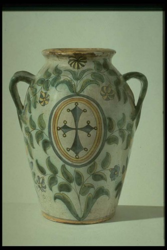 piede circolare indistinto piano. bocca circolare su breve collo svasato. Motivi decorativi: motivi decorativi floreali/ motivi decorativi a tralci di vite. Araldica: croce gemmata o pomata
