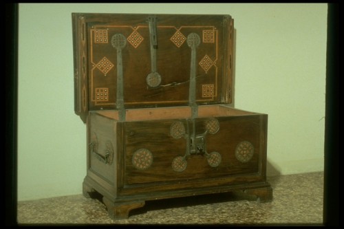legno di noce intagliato/ intarsiato / ferro a fusione/ battuto / avorio
