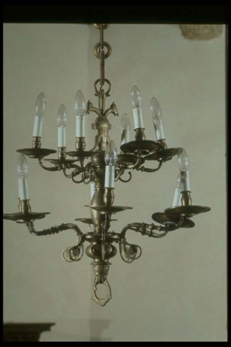 aquila bicipite coronata in apice, fusto a balaustro, decorazione terminale a testa di leone reggente anello a motivi fitoforme, bracci a forma vegetale stilizzata terminanti con fiore di girasole (?)