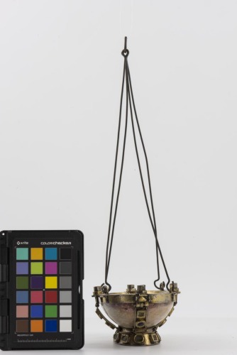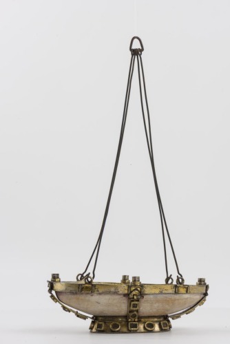 Montatura in argento dorato con piede ad anello, decorato da cabochons in vetro quadrati e rotondi compresi entro due linee di granuli. Coppa in avorio di forma ovale, liscia. Quattro fascette decorate da cabochons, inquadrate da linee di granuli, collegano la base alla fascia lungo l'orlo, anch'essa ornata da cabochons, dove si trovano quattro anelli per la sospensione e quattro portacandele