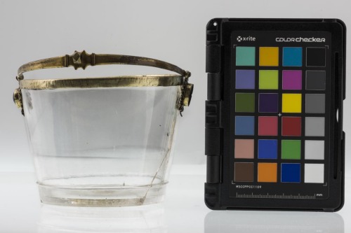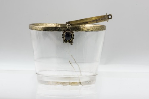 Fondo piatto e corpo di forma troncoconica in cristallo di rocca, liscio, con rosone centrale intagliato sul fondo. Orlo rifinito in argento dorato e manico dello stesso materiale. All'impostazione del manico, sui due lati, due cabochons contornati da festoni in filigrana