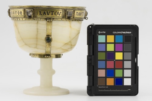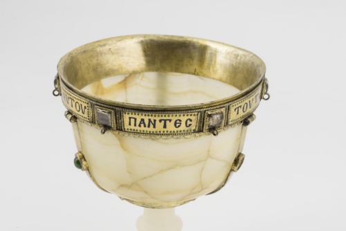 Base in alabastro con piede a disco e stelo cilindrico con ingrossamento anulare a metà dell'altezza. Coppa di alabastro. Montatura in argento dorato lungo la bocca e alla base della coppa, raccordata da tre elementi verticali sui quali vi è un cabochon di vetro rotondo. La montatura lungo l'orlo è decorata complessivamente da sei cabochons quadrati alternati ad altrettante placchette che riportano una iscrizione a smalto blu inquadrata da piccoli punti verdi a smalto. Sotto questa fascia corre una linea di festoni semicircolari. Sotto i cabochons sono fissati sei anellini che presumibilmente servivano per ulteriori decorazioni pensili.