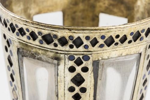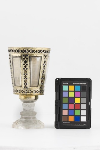 Base in cristallo di rocca costituita da un piede a disco, decorato con motivi fitomorfici; corto stelo con rigonfiamento anulare all'impostazione del piede e parte superiore cilindrica, decorata da scanalature verticali. Coppa troncoconica composta da una montatura in argento dorato, che contorna sei lastrine rettangolari in cristallo di rocca lisce. La montatura è decorata da motivi incisi circolari e a losanga, riempiti da pasta vitrea rossa o blu, ad imitazione di cabochons. Nelle losanghe sono inscritti uno o due cerchi concentrici in oro