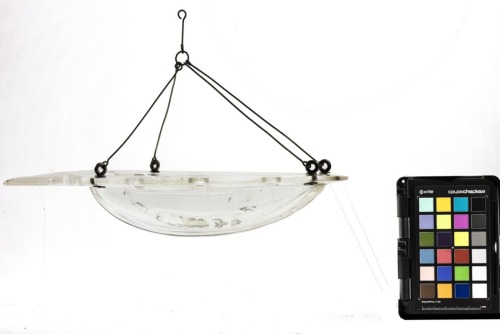 Lampada in cristallo di rocca con ampio bordo esterno piatto, sagomato a forma di pesce, che contorna una parte centrale concava, corrispondente al corpo del pesce, a forma di navicella. Sulla coda e sui due lati della fascia piatta vi sono rispettivamente tre gruppi di fori circolari
