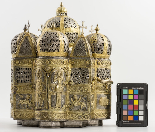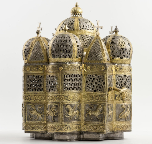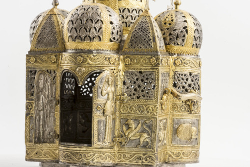 Oggetto in argento parzialmente dorato, a forma di edificio a pianta centrale quadrata, con quattro absidi coronate da quattro cupole che si alternano ad altrettante torri triangolari con copertura piramidale. Al centro vi è una cupola più alta, mobile, coronata da un laternino con galleria ad arcate. E' munito di due manici con attacchi costituiti da mascheroni con uomini barbati. Tutta la superficie è decorata: nella parte superiore da motivi a traforo di tipo geometrizzante, fitomorfico e floreale traforati, con profilature in argento dorato. Nella fascia inferiore da raffigurazioni di vario tipo entro riquadri profilati in argento dorato, e precisamente un putto con testa infilata in un cesto, un uomo che avanza verso una donna, un centauro, leoni, grifoni e sirene. Sui due sportelli, fermati da borchie trilobate, collocati in una delle absidi, vi sono due figure inquadrate da due archi: un soldato ed una donna che si indica la fronte con il dito, con iscrizioni ai lati