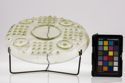 Piatto in vetro incolore circolare con piede ad anello. Il cavetto dalla parte esterna è decorato da quattro riquadri composti da quattro file di altrettante bugne a punta di diamante, alternati a dischi circolari con rilievo centrale, affiancati da due piccoli cerchi appuntiti