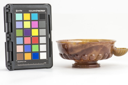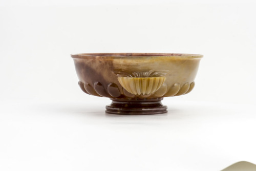 Piede a profilo sinuoso. Coppa espansa decorata nella parte inferiore da costolature verticali a testa arrotondata. Orlo estroflesso. E' munita di un'ansa, posizionata nella metà superiore della coppa, a forma di conchiglia
