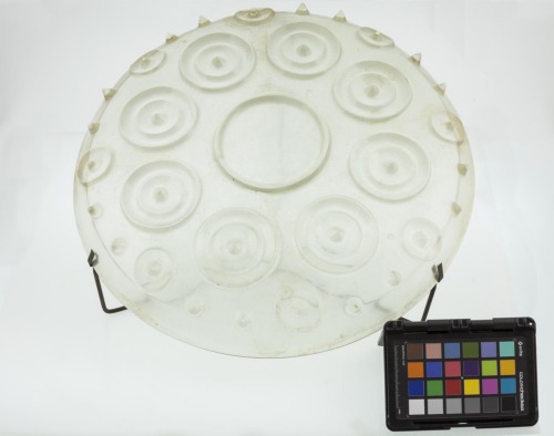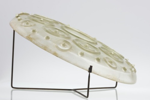 Piatto in vetro incolore con piede ad anello. Cavetto espanso, decorato nella parte inferiore da otto elementi circolari a due cerchi concentrici, con punta centrale rilevata, e, nella porzione superiore, da altri otto cerchi di dimensioni inferiori con analoga punta centrale rilevata, alternati a due bugne appuntite