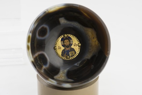 Alta base troncoconica in argento dorato con bordo piatto e ingrossamento anulare verso la coppa. Il bordo del piede è decorato da una fila di cabochons rotondi e rettangolari; al di sopra è incisa una iscrizione. Coppa emisferica di onice; all'interno vi è un medaglione smaltato, fissato con quattro chiodi a testa ineguale, con Cristo benedicente a mezzo busto, contornato da una fila di punti a smalto, con il Vangelo chiuso nella mano sinistra