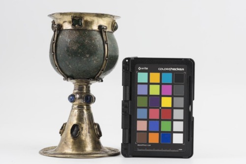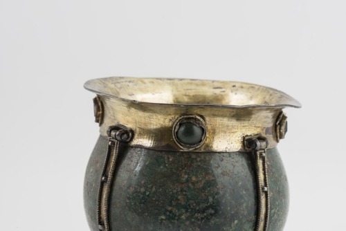 Alto piede troncoconico in argento dorato, con rigonfiamento anulare all'impostazione della coppa. L'elemento anulare e il piede, a circa metà della sua altezza, sono decorati da cabochons (granate, plasma e zaffiri) ovali sul nodo e circolari sulla base. Coppa piriforme in porfido verde screziato di giallo. Lungo l'imboccatura montatura in argento dorato con orlo estroflesso, raccordata alla base da quattro elementi verticali, decorati da granuli e perle. Anche la montatura lungo l'orlo è decorata da cabochons