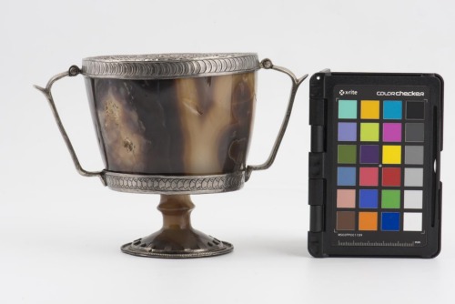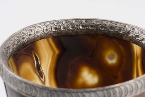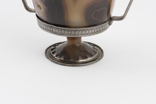 Piede in sardonica a disco, con stelo cilindrico e ingrossamento anulare a metà dell'altezza. Il diametro del piede è ornato da una montatura in argento dorato, con parte inferiore decorata da due file di granuli e parte superiore sagomata ad archi. Coppa troncoconica in onice, profilata da due fasce d'argento dorato: una, lungo il bordo inferiore, è decorata da una fila di pelte, quella superiore da una fila di squame e internamente da motivi seriali a foglie. Sulle due fasce si impostano due anse a "C" con una punta nella parte terminale e una sfera in corrispondenza dell'attacco superiore
