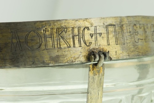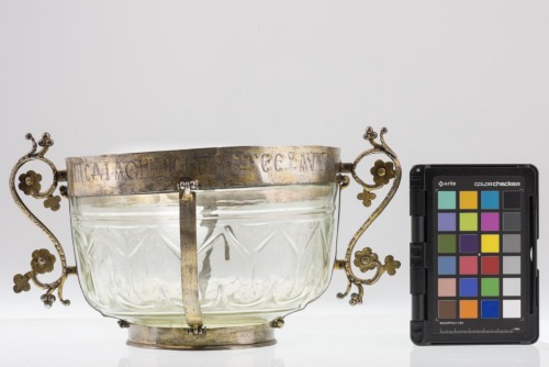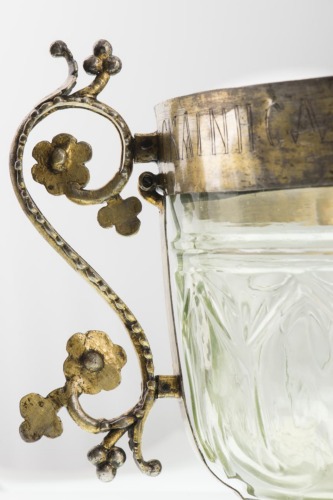 Base in argento dorato ad anello piatto, liscio. Coppa in vetro incolore, decorata a intaglio da una sequenza di elementi geometrici modulari a due aste verticali chiuse da un elemento a V, al di sotto del quale corre un motivo a onde. Orlo rifinito da una montatura in argento dorato, con una iscrizione incisa lungo il diametro. Delle bande in argento dorato, lisce, collegano il piede alla fascia dell'orlo. E' munito di due anse simmetriche ad "S", con parte finale terminante a spirale ornata di foglie, fiori e piccoli grappoli a tre grani