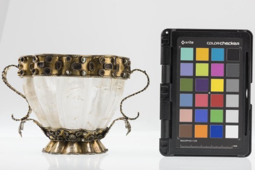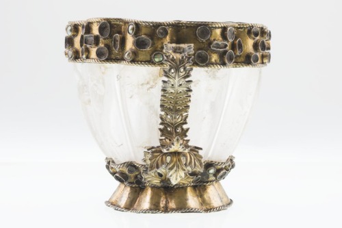 Base in argento dorato polilobata, profilata da un filo cordonato. Coppa in cristallo di rocca, con incise dieci profonde costolature verticali. La coppa è rifinita inferiormente e superiormente una fascia in argento dorato, profilata da un filo cordonato come il piede, decorata da cabochons e perle. Due anse simmetriche ad "S", sagomate e traforate a foglie dentellate, si impostano su un ulteriore segmento ad uncino, anch'esso sagomato a foglie; esse partono dalla montatura alla base della coppa e arrivano fino a metà della fascia lungo l'orlo