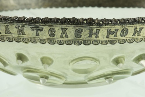 Lampada in vetro incolore con piede ad anello. Cavetto espanso, decorato nella parte inferiore da otto elementi circolari con punta centrale rilevata, e, nella porzione superiore, da altri otto cerchi di dimensioni inferiori alternati a due bugne appuntite. Una fascia in argento dorato con iscrizione incisa rifinisce l'orlo; è decorata superiomente da un motivo fitomorfico e inferiormente da una serie di elementi semicircolari. Tre anelli equidistanti ne permettono la sospensione