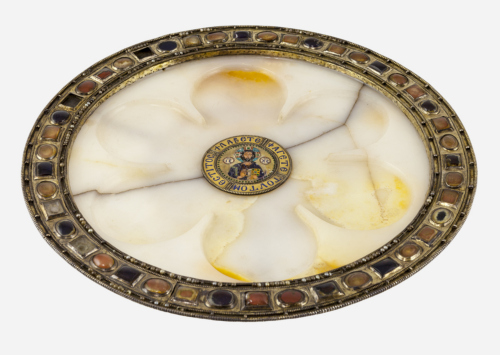 Piede troncoconico in argento dorato. Cavetto in alabastro, con un motivo inciso a sei lobi, disposti a petali attorno ad un medaglione centrale in oro, con busto del Cristo benedicente realizzato a smalto cloisonneé, contornato da una linea puntinata blu e da una iscrizione a smalto blu, delimitata e divisa in quattro parti da file di granuli. Il Cristo, con manto blu, ha un'aureola crociata e regge un evangeliario con la mano destra. Orlo rifinito da una fascia in argento dorato piatta, profilata superiormente e inferiormente da una doppia linea di granuli con una fila di piccole perle centrali. Entro queste profilature vi è una fila di cabochons in cristallo di rocca, rettangolari e ovali, incastonati su lamine metalliche rosse e blu. Il piede si raccorda alla montatura dell'orlo (dove vi è una fila festonata che corre al di sotto) da tre fascette.