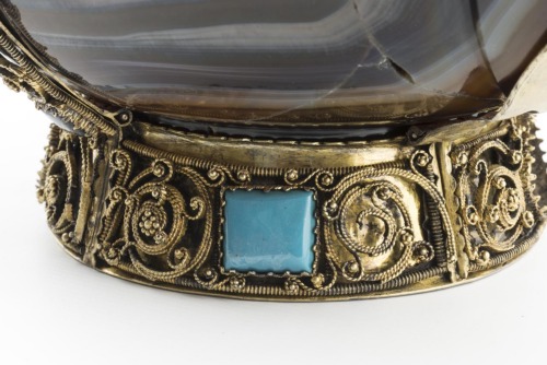 Basso piede troncoconico in argento dorato, con decoro in filigrana a listellli rilevati, cesellati a cordone e con piccole sfere, organizzati in un motivo a volute alternate a cabochons in pasta vitrea quadrati e rotondi. Coppa emisferica in onice, liscia. Orlo rifinito con montatura in argento dorato, che ripete lo stesso motivo decorativo in filigrana a volute alternate a cabochons del piede, se pur di dimensioni inferiori. Due fasce ornate da doppie volute in filigrana e cabochons quadrati collegano il piede e l'orlo. Le due anse ad occhiello, con parte superiore piatta mistilinea, sono ricavate dallo stesso blocco in onice della coppa. Altre due fascette, aggiunte in epoca recente, tengono insieme i manici