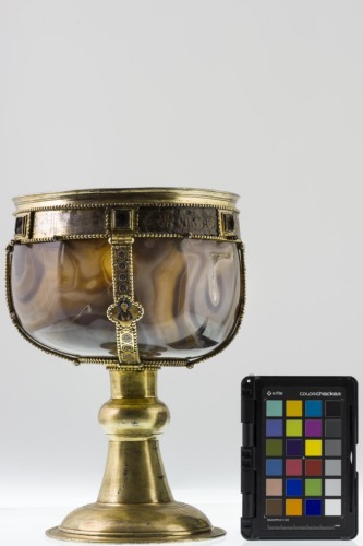 Il piede è un'aggiunta di epoca posteriore. Secondo lo studio di Hahnloser (1971) l'opera fu forse realizzata a Costantinopoli, in considerazione della qualità dell'intaglio della coppa e degli smalti, presumibilmente tra la seconda metà del X e gli inizi dell'XI secolo. Gli anellini erano usati per ulteriori decorazioni pensili andate perdute