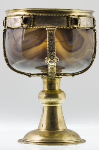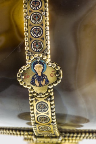 Alta base in argento dorato con piede troncoconico a sezione bombata nella parte inferiore, decorato da linee parallele incise. Stelo con rigonfiamento ad anello verso la coppa. Coppa emisferica in sardonica, liscia, con montatura in argento dorato, costituita da una fascia lungo l'imboccatura e da una placca anulare alla base della coppa. I due elementi sono collegati da quattro fascette; tutte le componenti della montatura sono profilate da grossi granuli. La fascia lungo la bocca è decorata da sei cabochons quadrati in vetro; sono presenti anche dei piccoli anelli. Tra i cabochons vi erano delle placchette con un'iscrizione, andata perduta. Sulle fascette di collegamento è presente una decorazione a smalto con motivi a palmette/rosoni sovrapposti, su fondo oro. A metà di ciascuna sono collocati medaglioni quadrilobati, all'interno dei quali rispettivamente vi è Cristo, la Vergine, San Giovanni Battista e San Basilio, ritratti a mezzo busto e realizzati a smalto