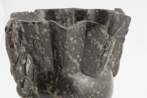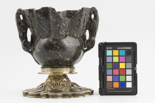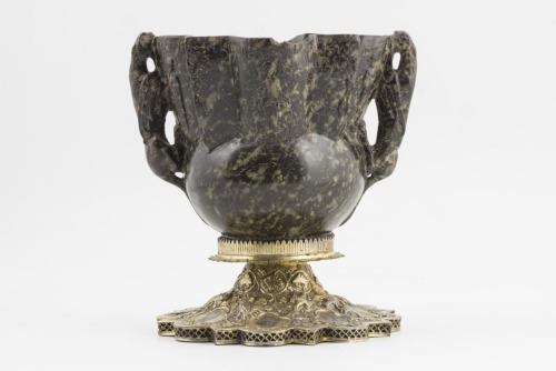 Piede polilobato in argento dorato. Coppa monoblocco in serpentino verde scuro chiazzato, con parte inferiore semisferica e parte superiore sagomata a otto costoloni, alternativamente convessi e ad angolo. E' munita di due anse simmetriche, con attacco inferiore a metà della porzione semisferica e quello superiore sull'orlo, sagomate a ghepardi alati, con particolari anatomici realizzati a incisione. Le parti aggettanti sono decorate da dieci figure intere, nimbate, a bassorilievo: Cristo e la Vergine in atteggiamento orante, i quattro arcangeli e quattro santi, rispettivamente Giovanni Crisostomo, Basilio, Nicola ed un altro santo non individuabile